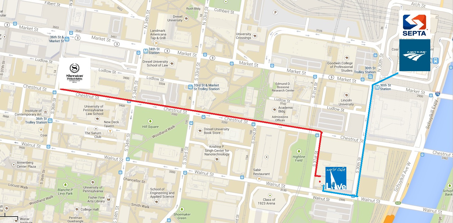 Marked on this map is the Sheraton Philadelphia University City Hotel (at the corner of 36th and Chestnut Streets) … if you’re staying there, you’ll walk east on Chestnut (down numbers) to 31st Street. There you’ll make a right and head down the block to the entrance to World Cafe Live on the left side of the street.