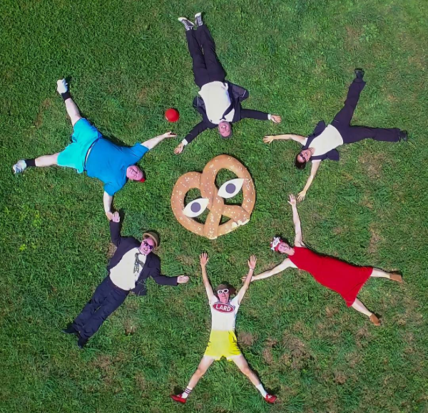 The Human Lard Dog is a cartoon character come-to-life who descends from planet Belopio on a Giant Pretzel to take you and your family on a musical journey of absurdism, frivolity, and unbridled joy. Lard Dog and his 6-piece Band of Shy invite you to their unique audio-visual universe complete with catchy songs, interactive props, multi-media graphics. While you may not know what the songs mean at first, you don’t doubt that the Lard Dog believes every word. This lends weight to catch phrases like “shyness is power” and “slurp the noodle of life.”